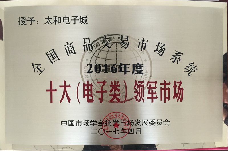 太和電子城榮獲 2016年全國商品交易市場系統十大電子類領軍市場